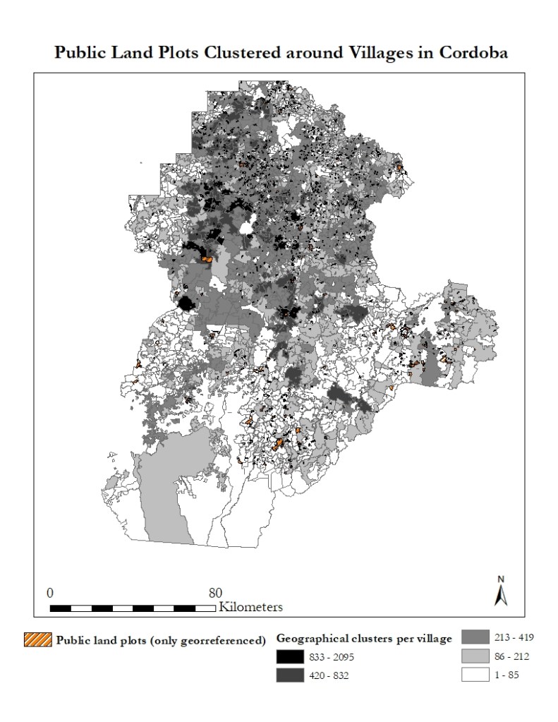 In Córdoba, public land was allotted by local judges in 597 villages (50,4%), yet 22,61% of land plots are in only 6 villages (1%) and 55,6% of registered plots are placed in other 18 villages (3,01%). This geographical variation suggests that the judicial allocation of public land may have had a concentration effect in Córdoba.