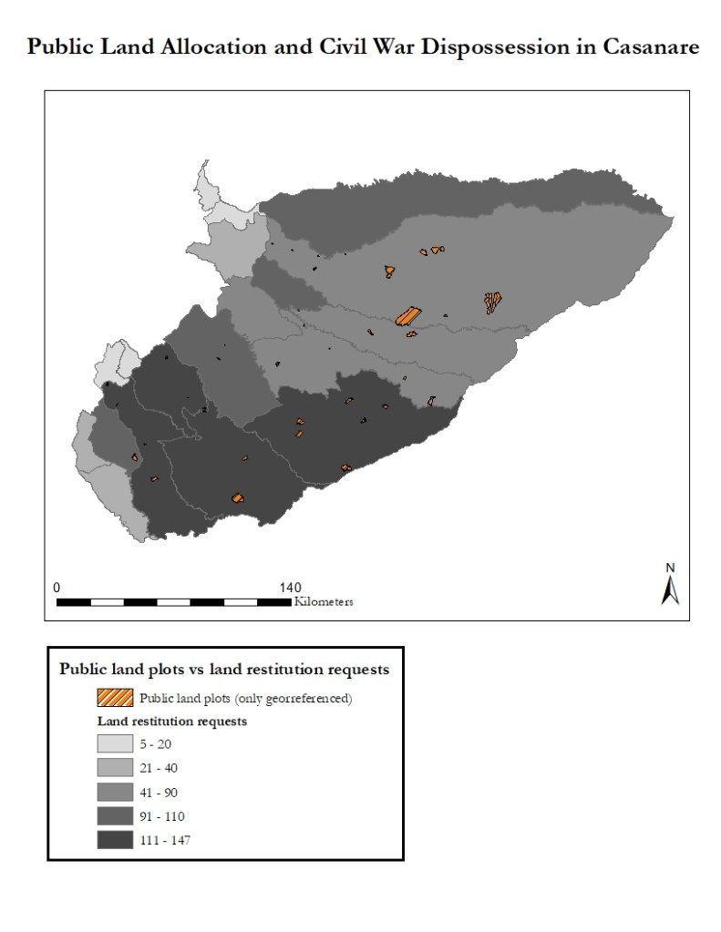 I also geo-referenced land restitution claims and public land allocation in Casanare. The map below suggests there is not spatial correlation between these two phenomena.