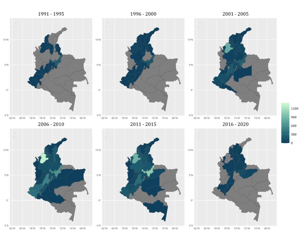 This set of maps displays the number of public land plots handed in by local lower court judges from 1991 to 2018. The darker the department, the higher the number of public land plots. Two clear clusters emerge from this map: one located in the Caribbean region (the northeastern area), and another placed in the Andean region (central area). These maps also show that the phenomenon under study was initially clustered in focal points in early 1990s and began expanding nationwide in the late 1990s and early 2000s. Since 2003, local lower courts significantly allotted public land in Córdoba compared to other departments. Then, Boyacá emerged as another niche for the judicial allocation of public land in mid-200s. After 2016, this phenomenon has shrunk in spatial terms, being limited to Caribbean departments.